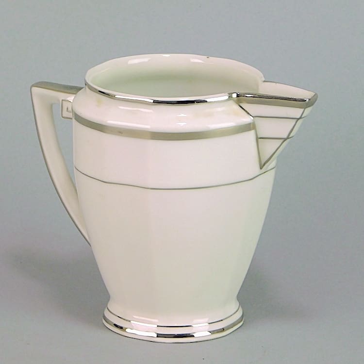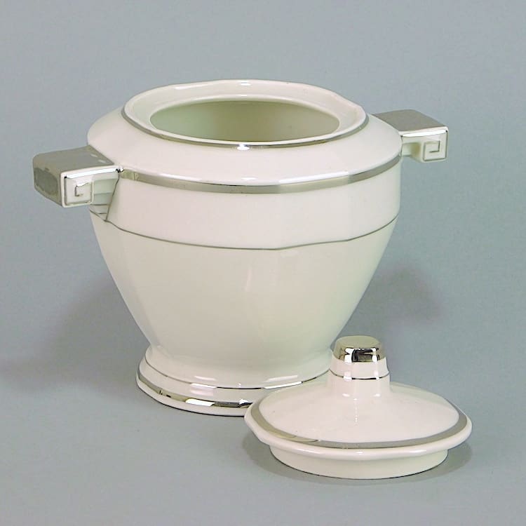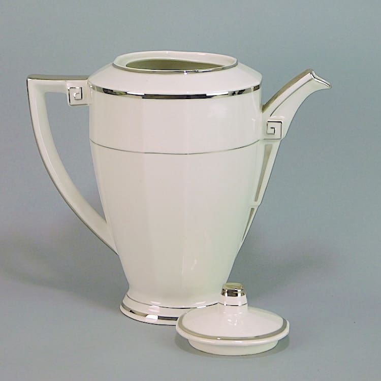 Large size French Limogue tea set with silver Greek key pattern detail.