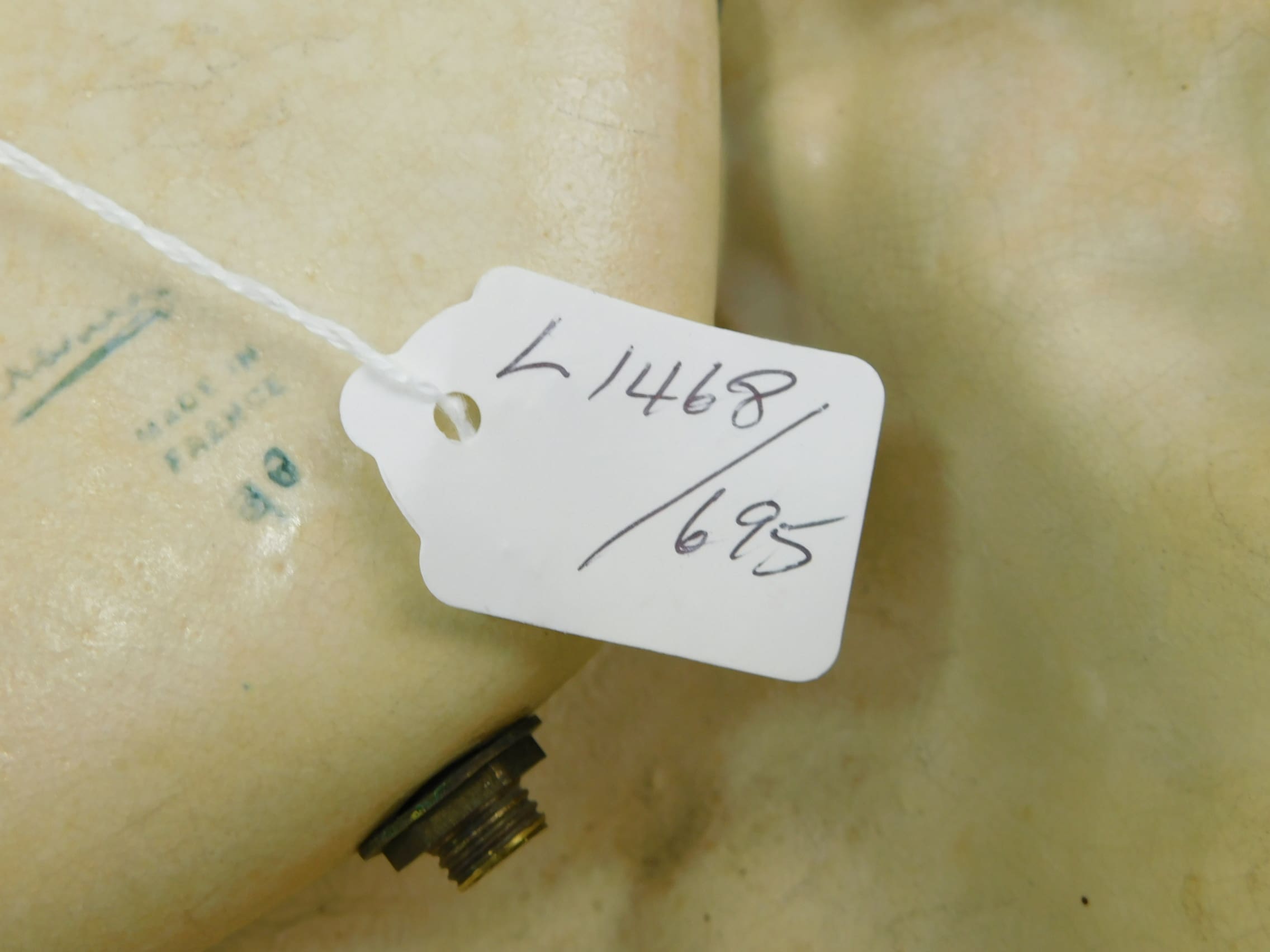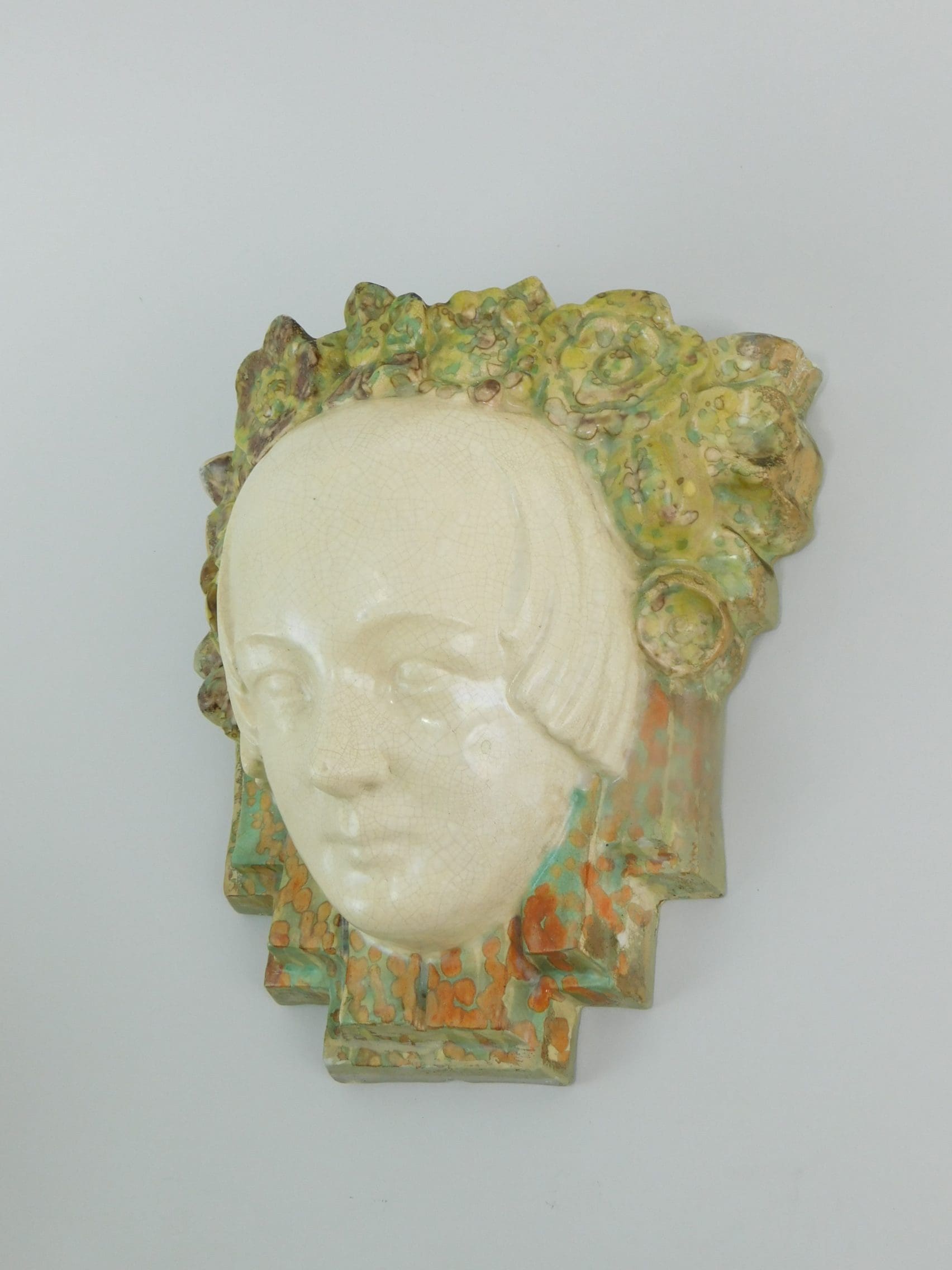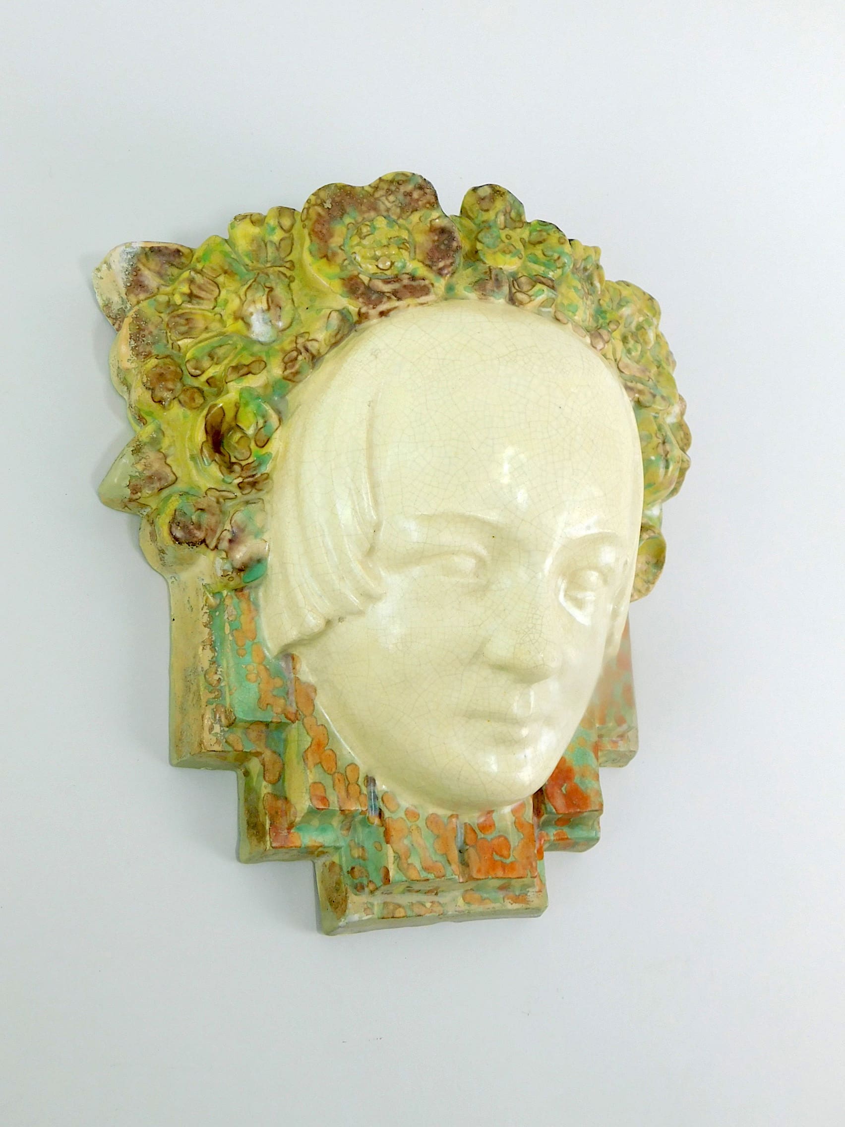 A rare French white terracotta wall uplighter. A white crackle glaze head with stylised floral enamel drip glaze finish. Marked to the back Made in France and bearing an indistinct signature – possibly Cremier?
