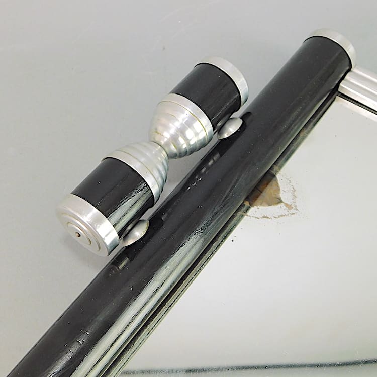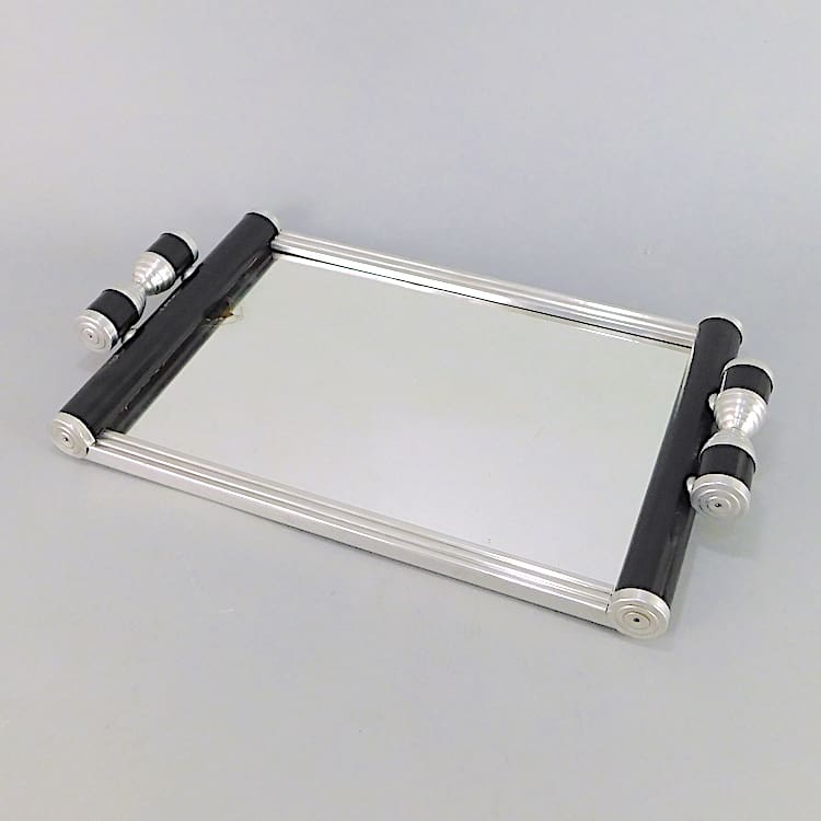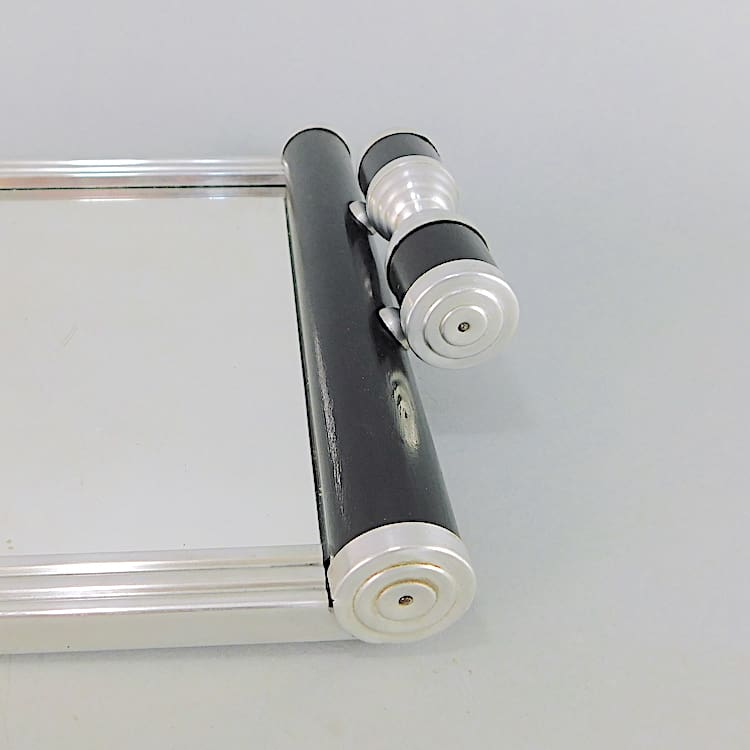 A wood and metal, mirror glass bottomed tray with scroll handles and metal end caps.