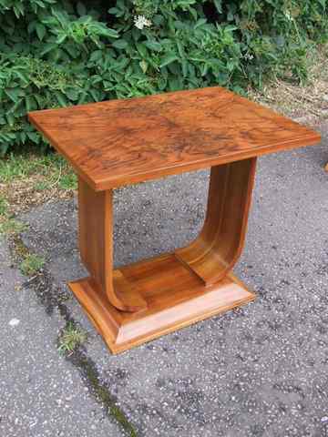 French art deco flame walnut side table with U shaped base. Another fine quality table but unfortunately maker unknown.