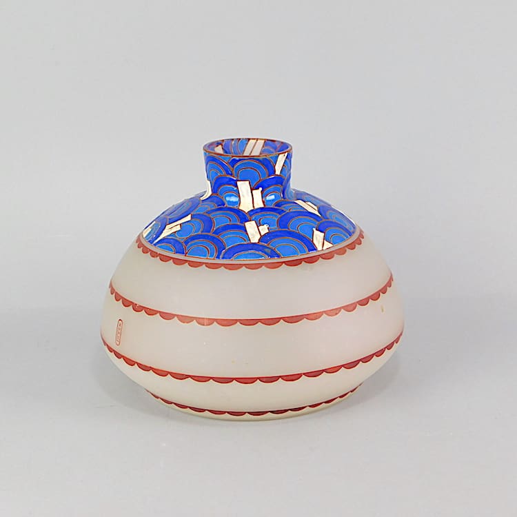French Art Deco vase made of Daum glass and hand painted with high enamel from a design by Hellingenstein. Made by and signed Leune- Daum brother.