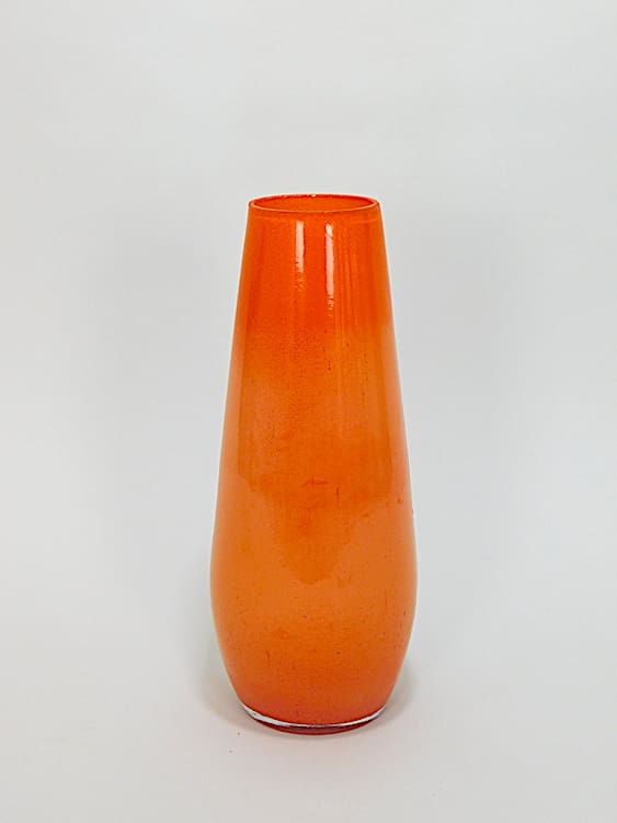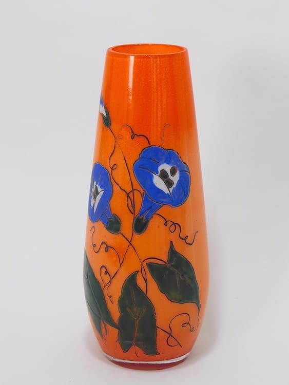 Glass vase with orange ground and blue nasturtiums hand painted on to the surface but no makers marks.