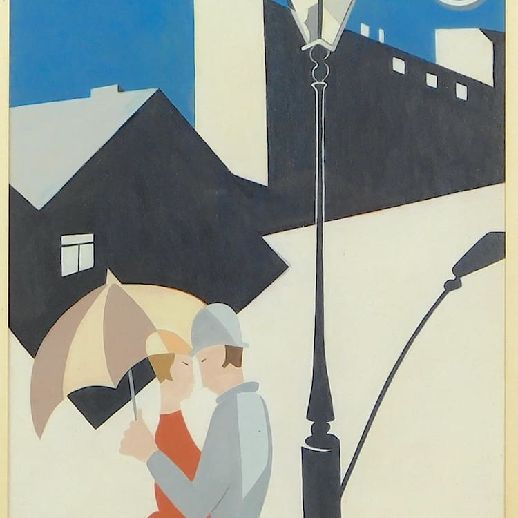 Original French water colour dating to the 1920s, initialled indistinctly, possibly YL. It depicts a man and lady under an umbrella and is framed in its original old wooden frame.