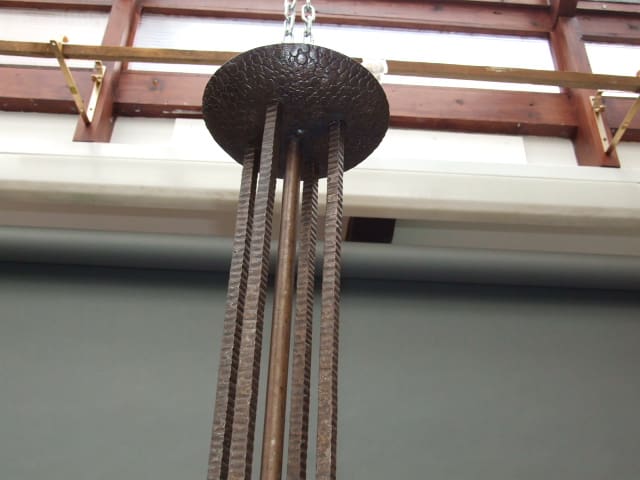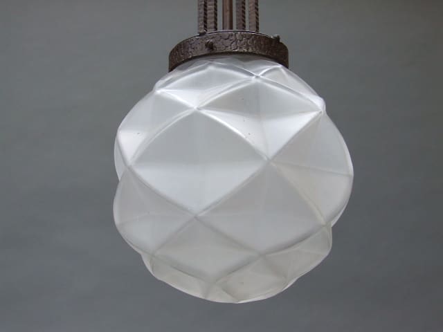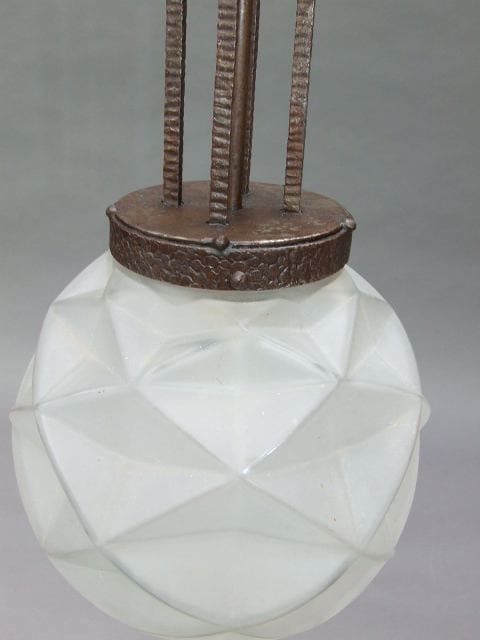 A French art deco wrought iron ceiling lamp with multi faceted globe shade.
