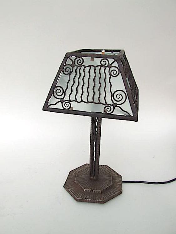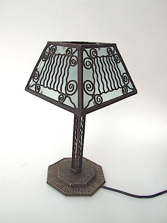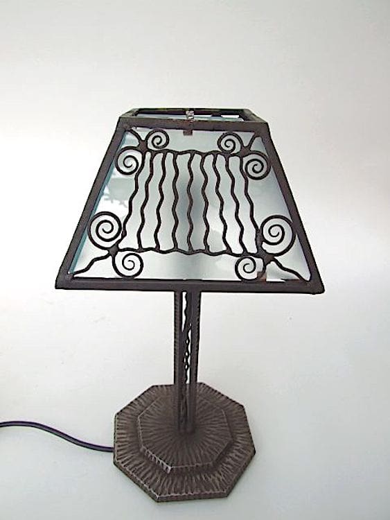 Beautiful wrought iron French table lamp with frosted glass panel shade.