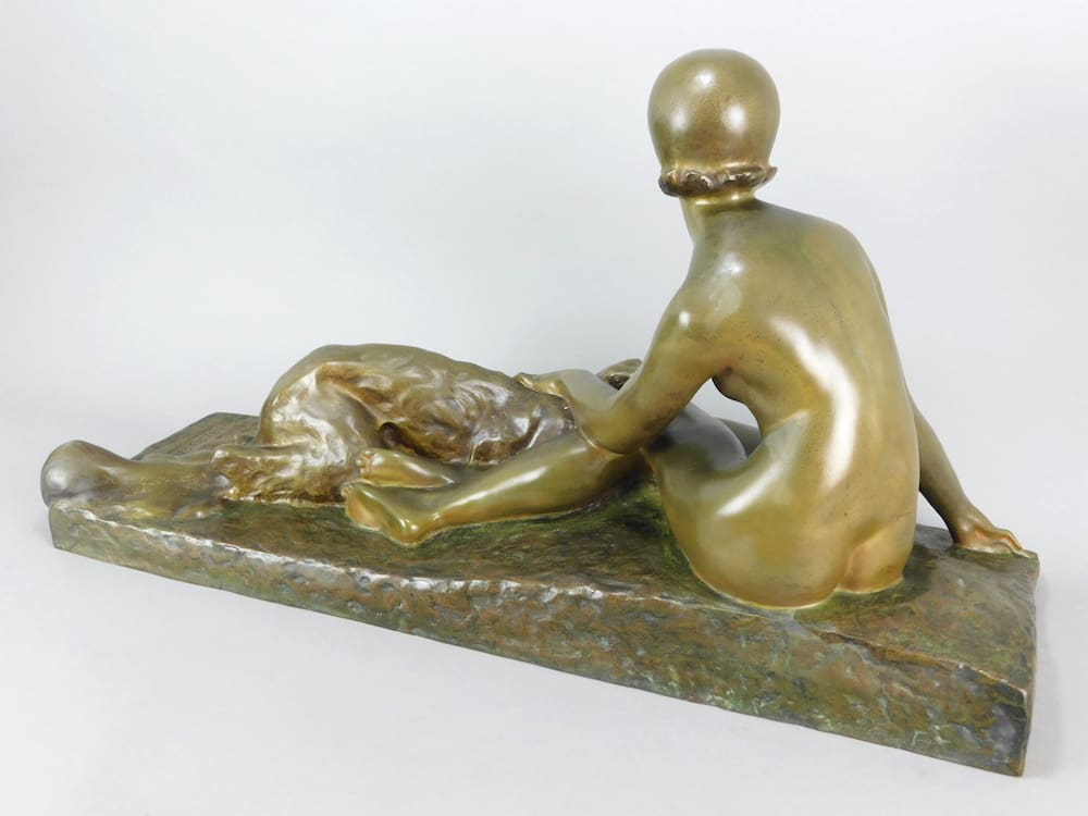 Large French quality bronze figural group of a lady and borzois. It has a lovely aged golden bronze patina and is signed in the bronze – Georges Coste. It is also marked at the back ‘cire perdue’, which pertains to the lost wax method of production.