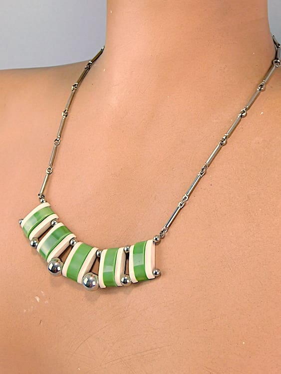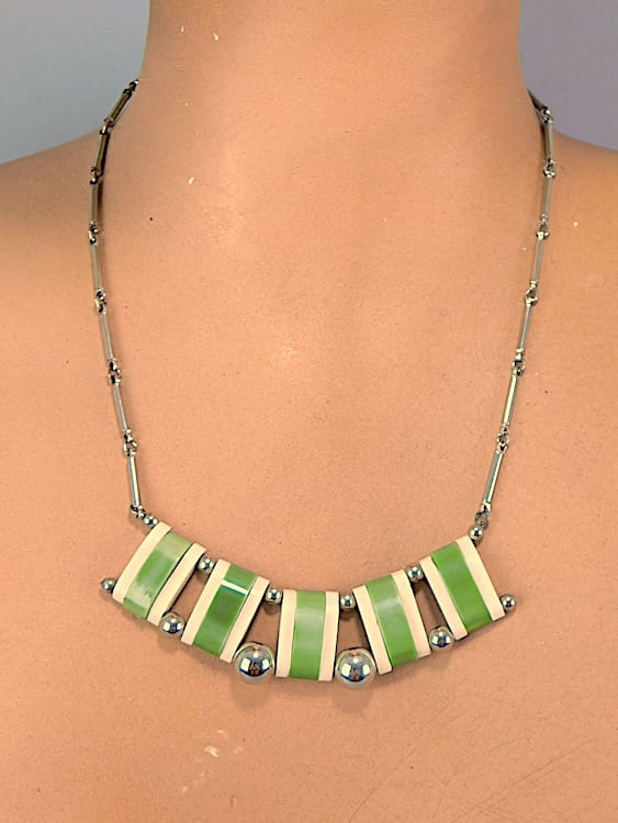Early 1930’s Jakob Bengel modernist fan fringe necklace in chrome and green and cream galalith.