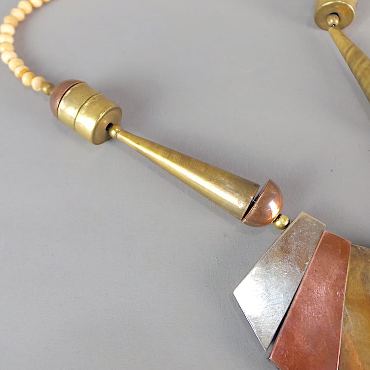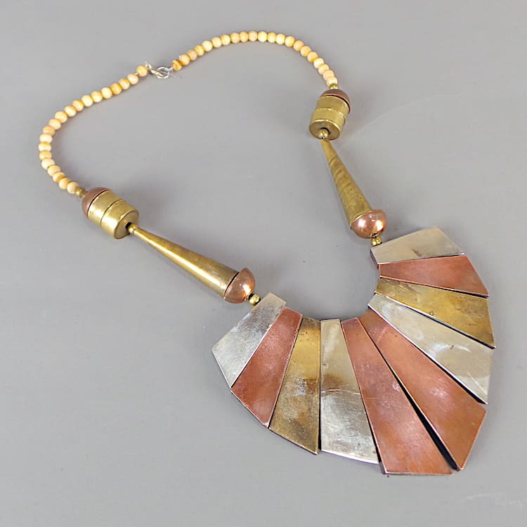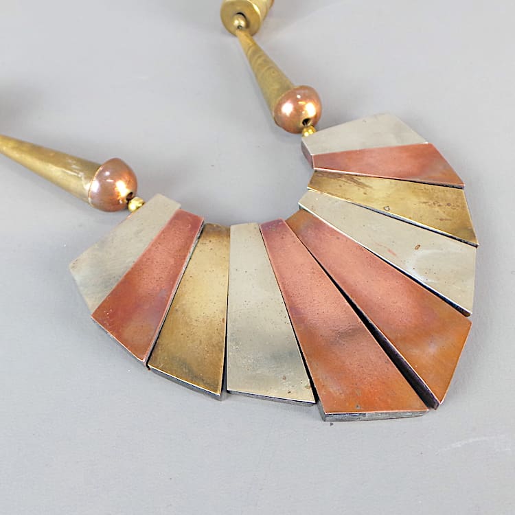 Metal-clad phenolic chunky American art deco modernist fringe necklace.