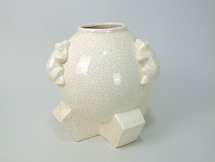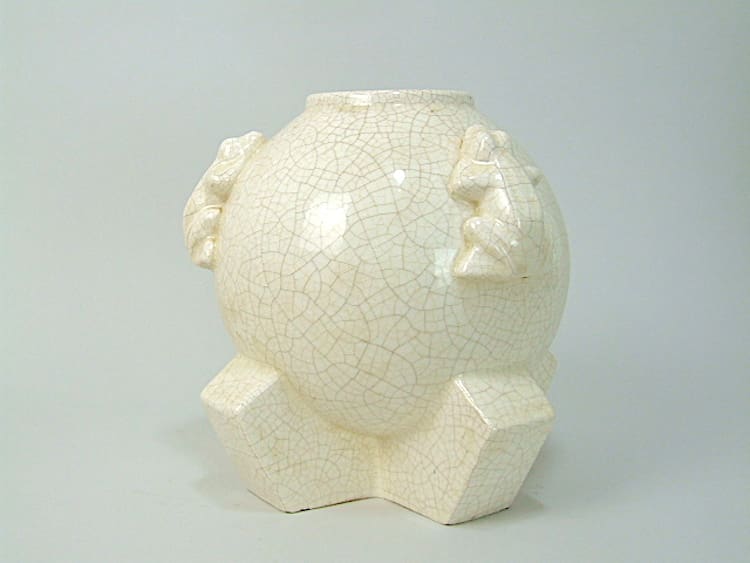 Large French art deco ceramic craquelier ball vase with 3 frogs around the top. Made by Orchies but cannot see a signature.