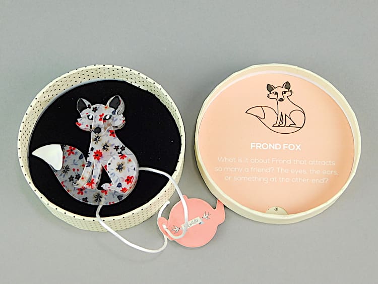 Frond fox brooch by Erstwilder. Comes in its original box with tag. Stamped with the Erstwilder bird logo.
