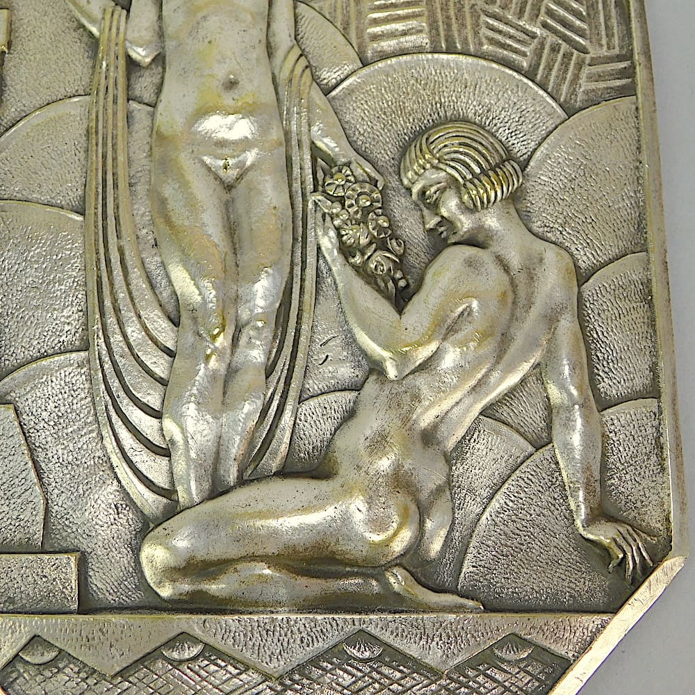 French art deco silvered bronze furniture panel with 2 nude females.