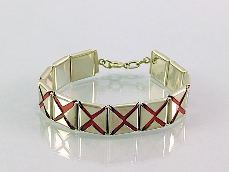 Red galalith panels sandwiched in folded chrome bracelet, made in the early 1930’s by the Jakob Bengel company.