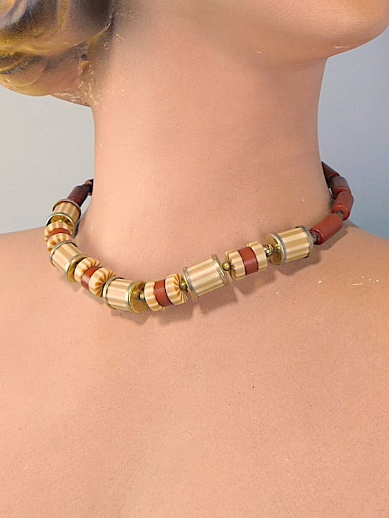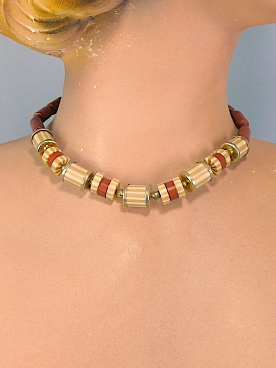 Guilt metal with galalith and wooden beads. Made in the 1920’s.