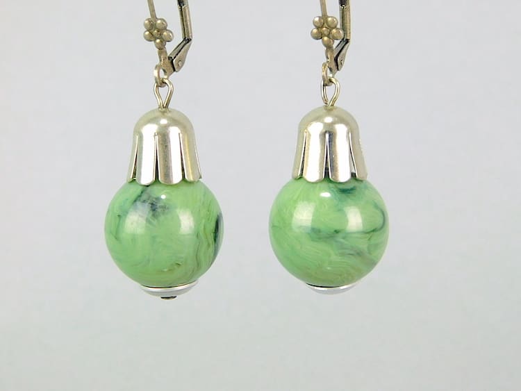 Marbled green galalith earrings for pierced ears, made by Bengel in the early 1930’s.