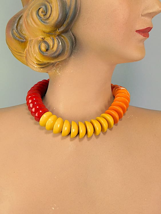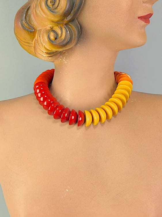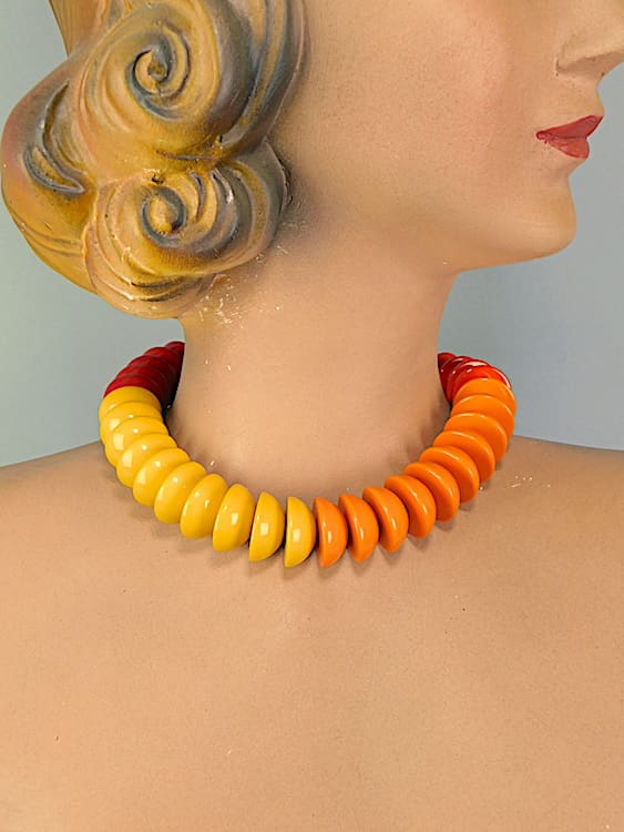 Vintage orange, yellow and red galalith half ball choker necklace. Strung on elastic, it can be moved around the neck to show whatever colour you choose. Will fit over most head sizes as it is elasticated.