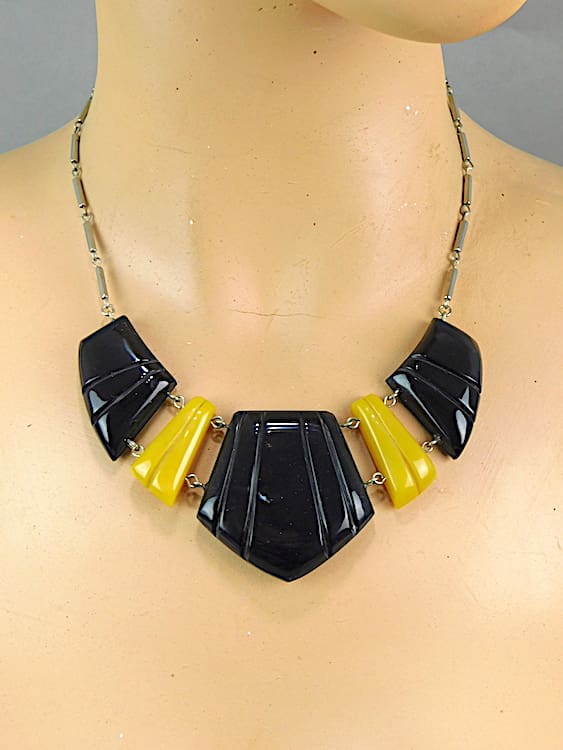 Stunning chunky Bengel necklace with ribbed black and yellow galalith.