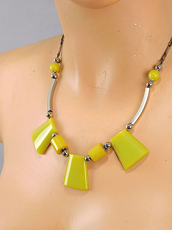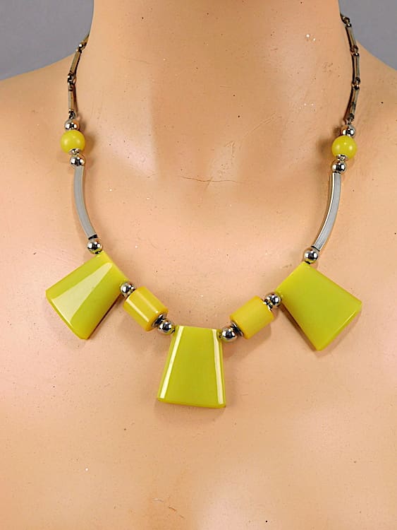 Chunky lime green galalith and chrome necklace made in the early 1930’s by Jakob Bengel.