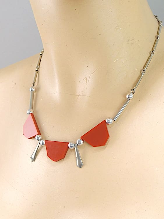 Red galalith and chrome necklace by Jakob Bengel.