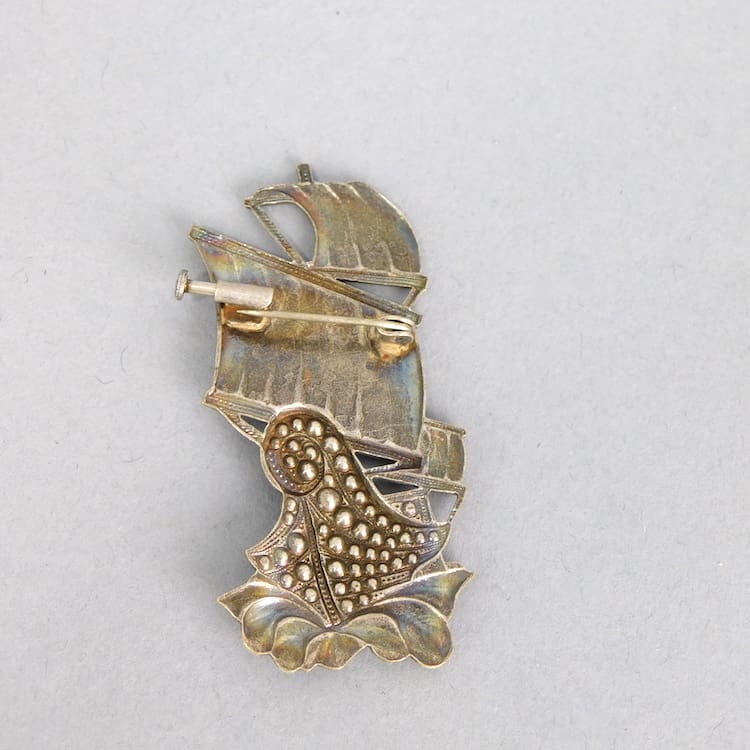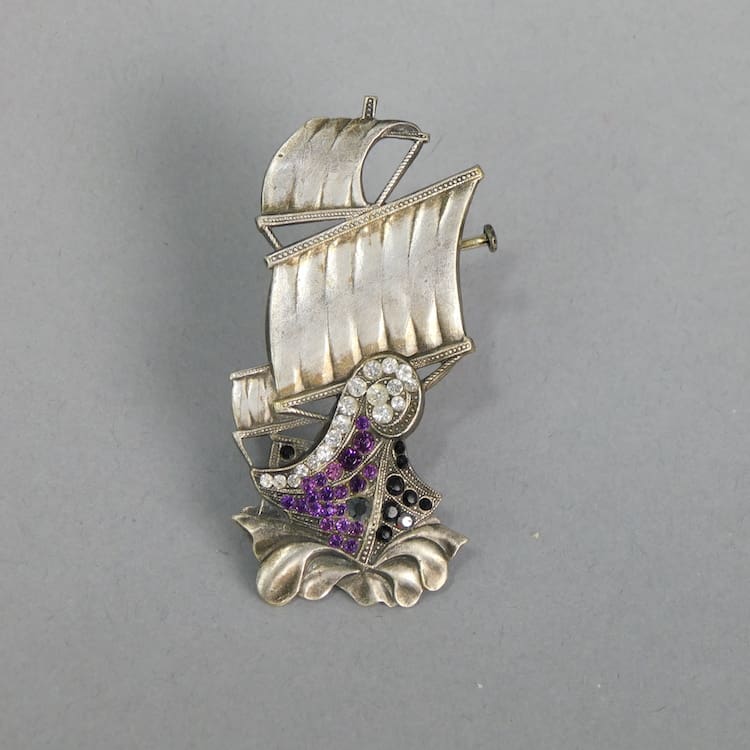 Unusual rhinestone galleon brooch by Pierre Bex.