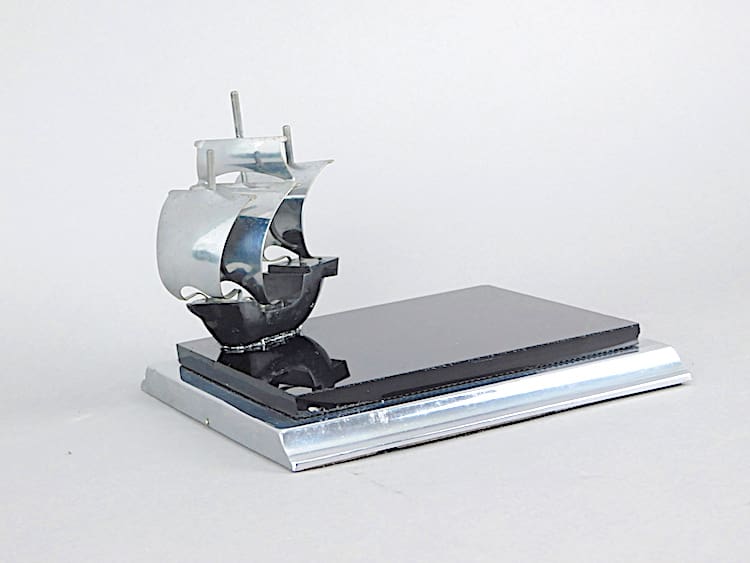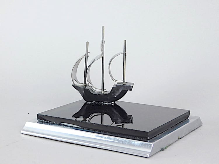 Lovely black vitrolite and chrome base with black wood and chrome galleon to one side. Made for the desk as a paperweight and to put you cup or notepad on.