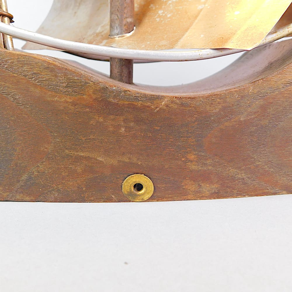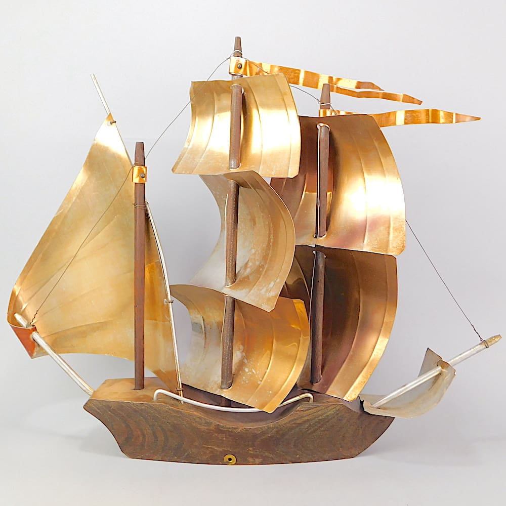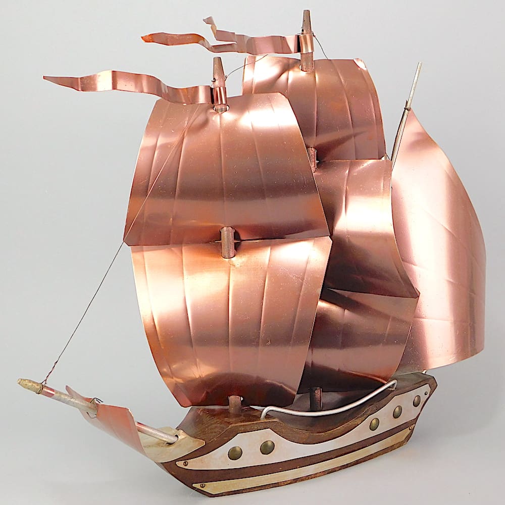 Hand made art deco wooden galleon with copper plate sails.