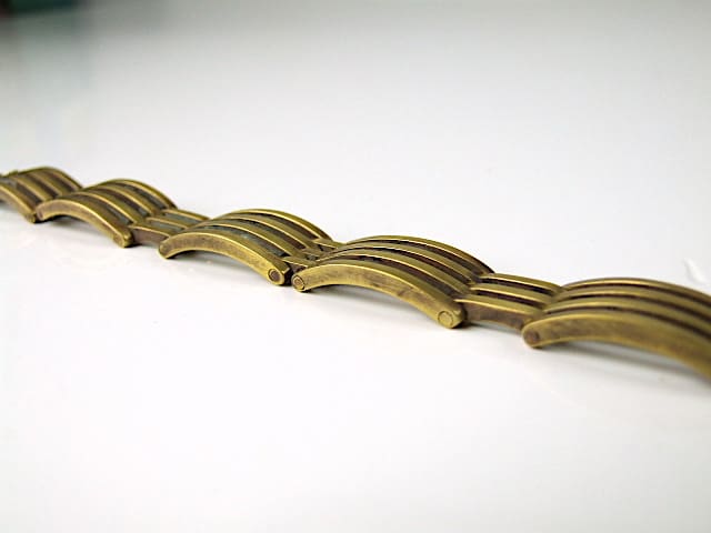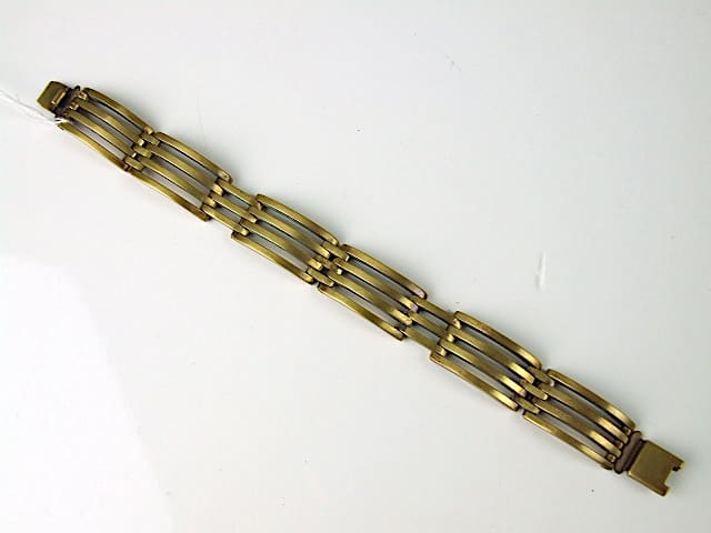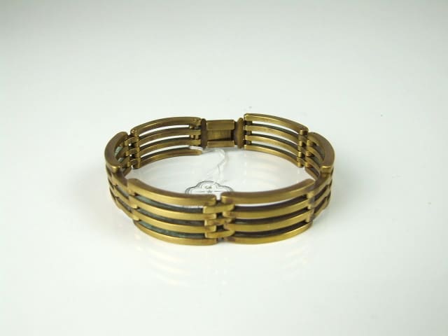It measures .5 inches (1cm) wide and 7.5 inches (19cm) long from clasp to clasp and so will fit a small to medium sized wrist.