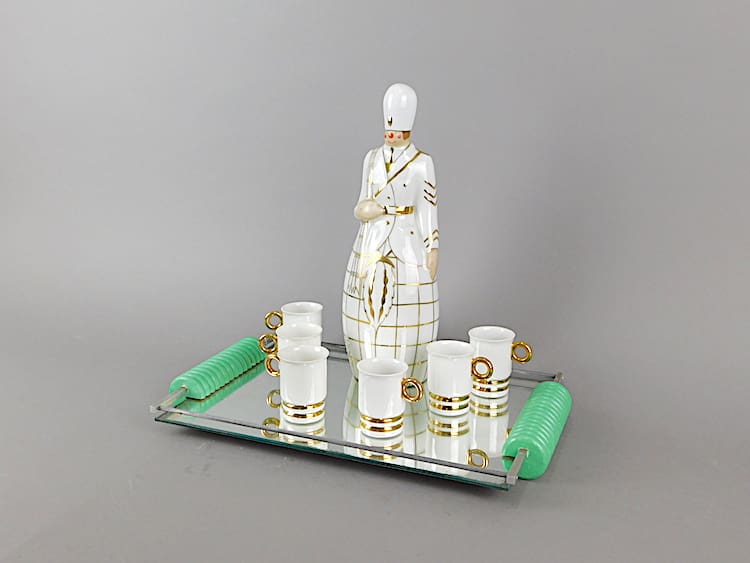 A French ceramic set comprising the flacon, modelled as a Scots Guardsman, 6 cups and a mirror glass tray. The bottle and cups all bear the early Robj stamp to the base.