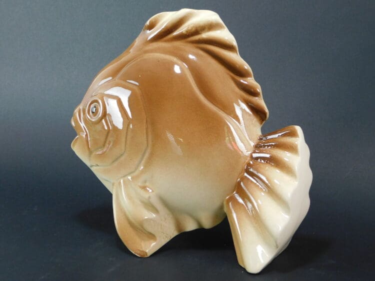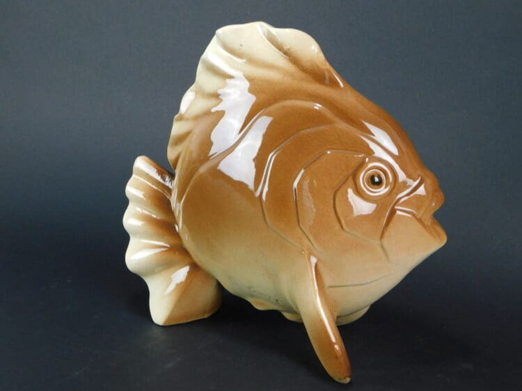 A stylised crackle glaze fish in cream and brown glaze – a signed piece by Geo Conde. Marked France and model number 730, and has another impressed mark which is indistinct, but probably St Clement. Conde made 2 versions of this piece and this is the smaller version.