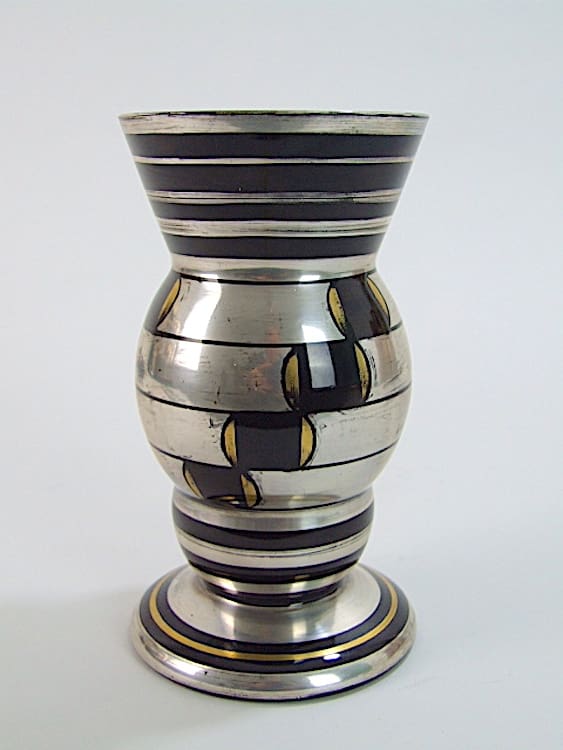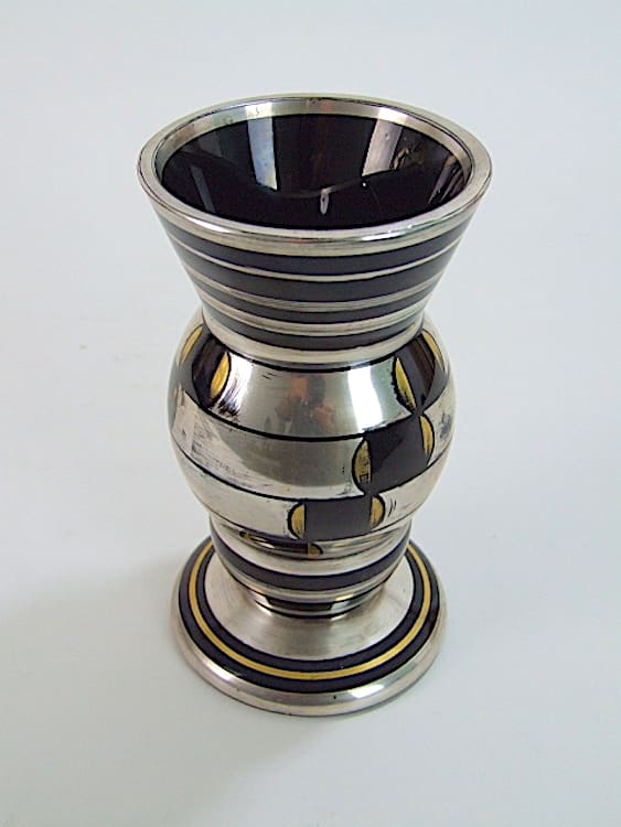 Black glass with geometric gold and silver patterning in geometric form. An unsigned Hem – Michel Herman Verrerie Michel Herman 12 Rue Martel Pairs.