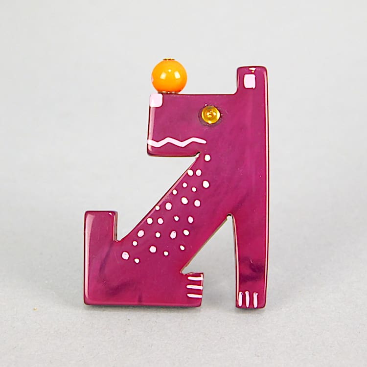 French vintage galalith hand painted dog brooch by Marie-Christine Pavone. Signed to the reverse and fitted with a roll safety clasp.