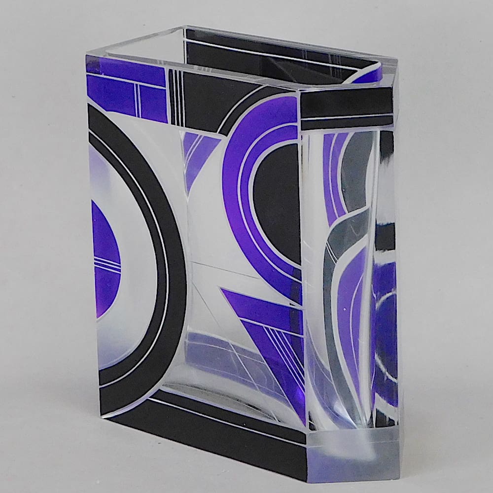 Geometric patterning in an unusual dark blue and black enamelling in an art deco design.