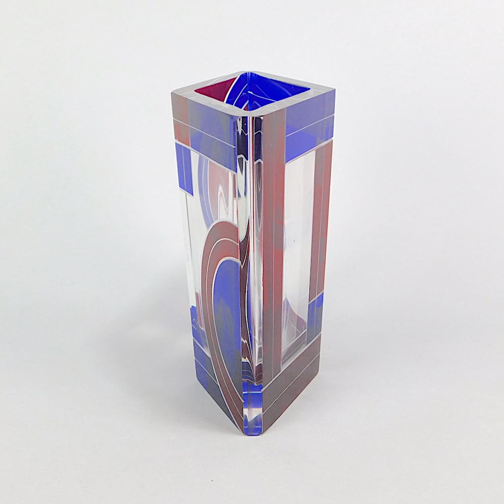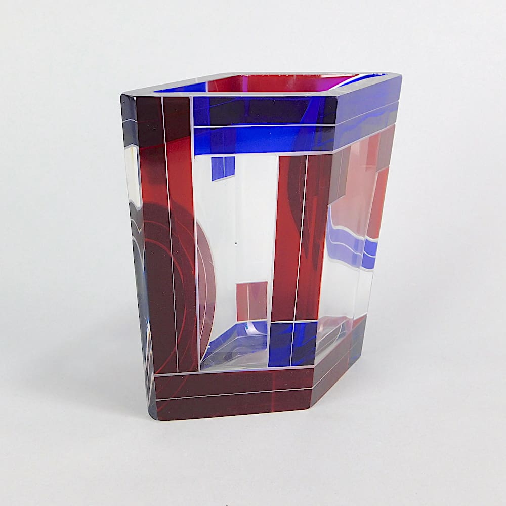 Czech leaded glass diamond shaped vase. Geometric patterning in an unusual red and blue enamelling in an art deco design. Unsigned but attributed to Karel Palda.