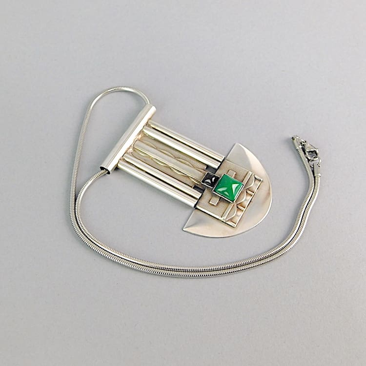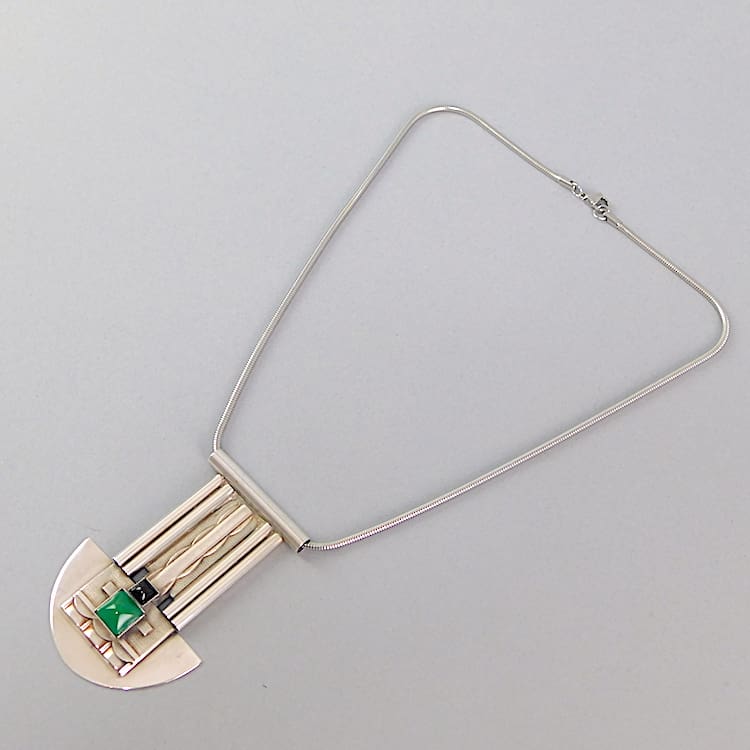 Silver plated art deco necklace with green and black onyx stones.
