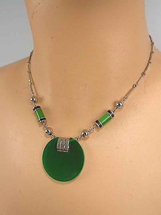 Jakob Bengel necklace made in the early 1930’s.Fabulous modernist geometric design in chromed metal and green galalith.