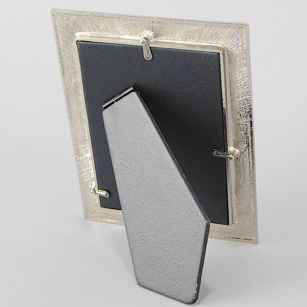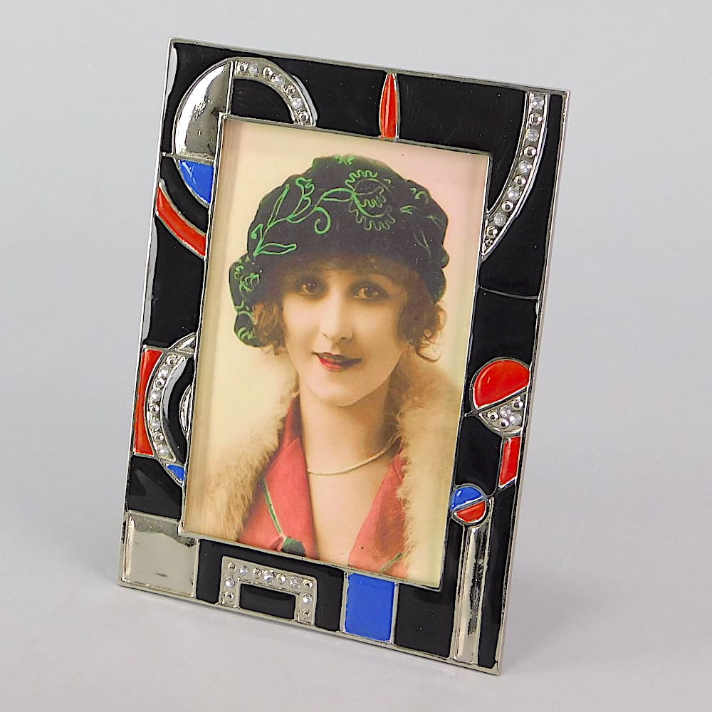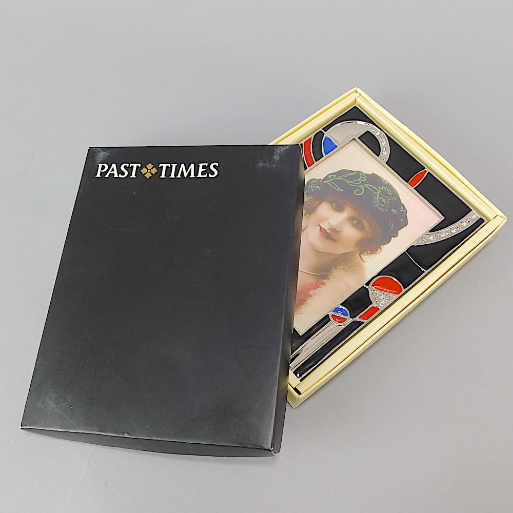 1970s paste times photo frame with black enamelling and hand painted red and blue geometric semi circles. It has an easel stand to the back and comes with its original gift box.