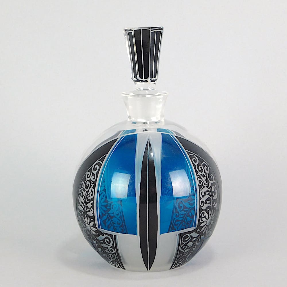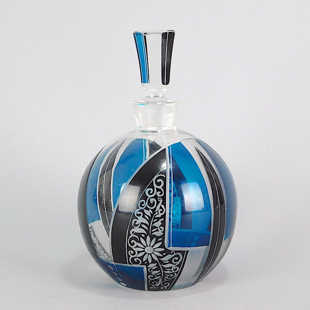 Czech geometric Karel Palda style scent bottle. With blue tinted and black enamelling patterning.