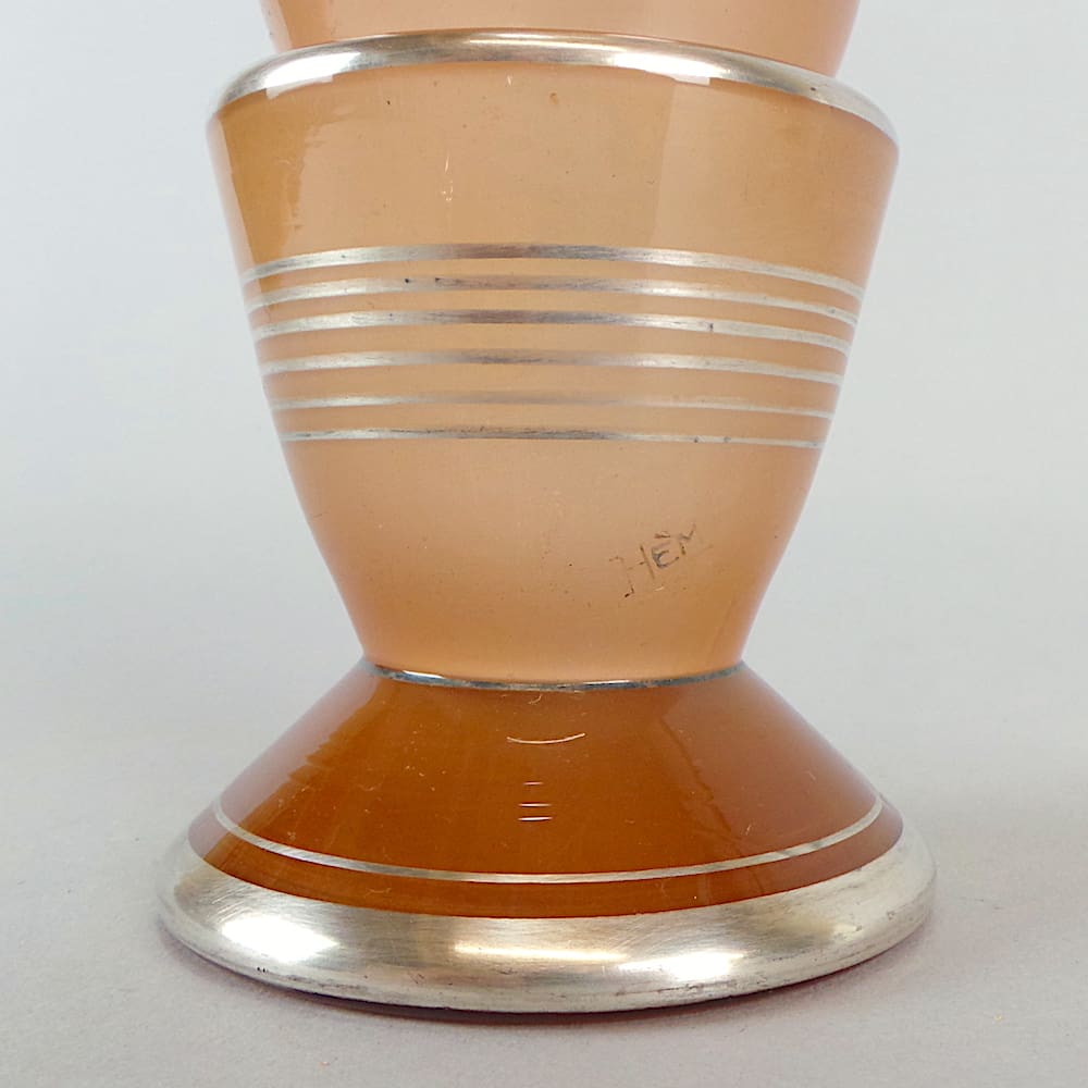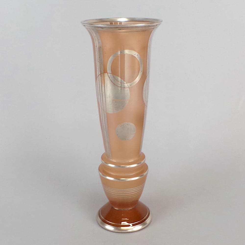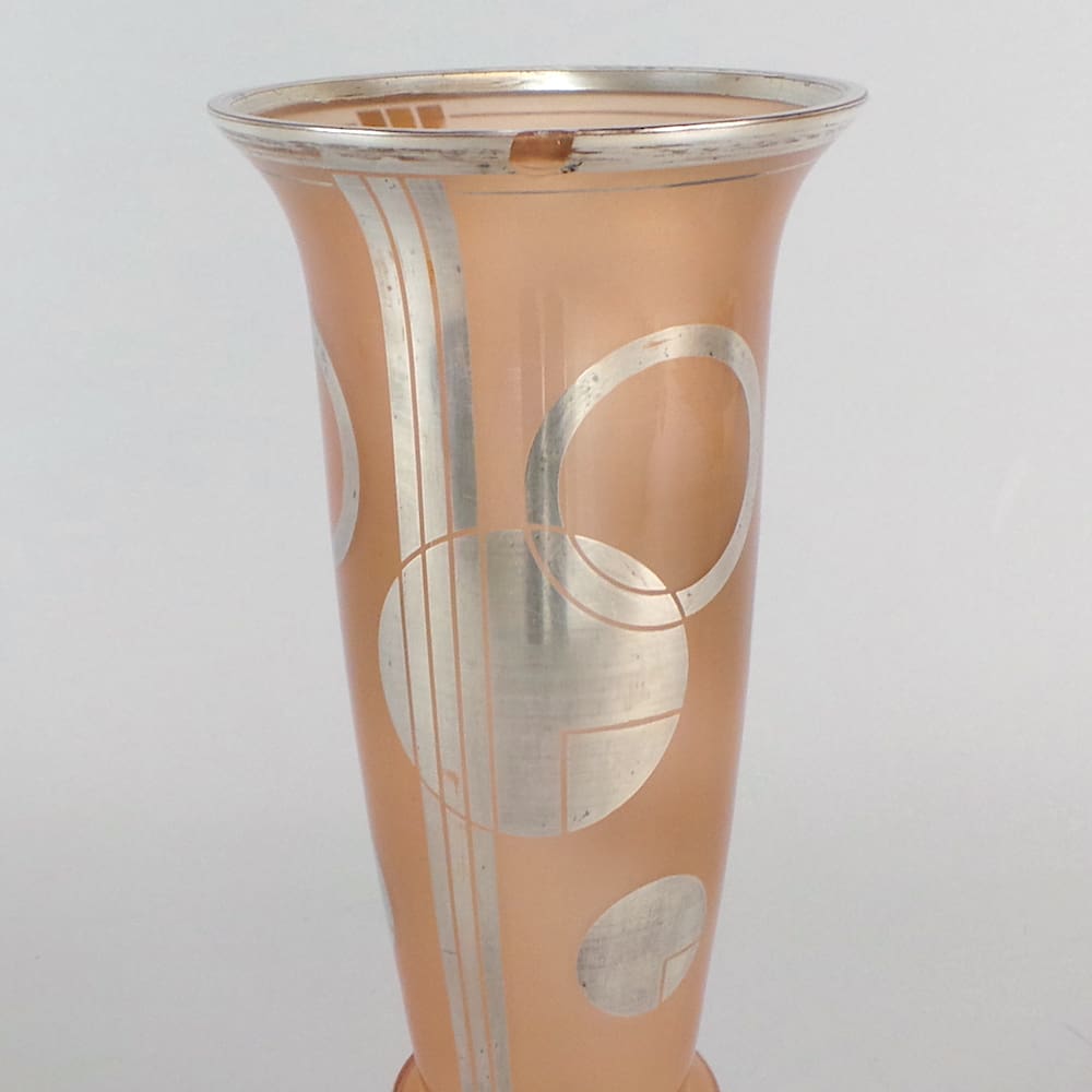 Rare French art deco silver patina on pink tinted geometric glass vase.