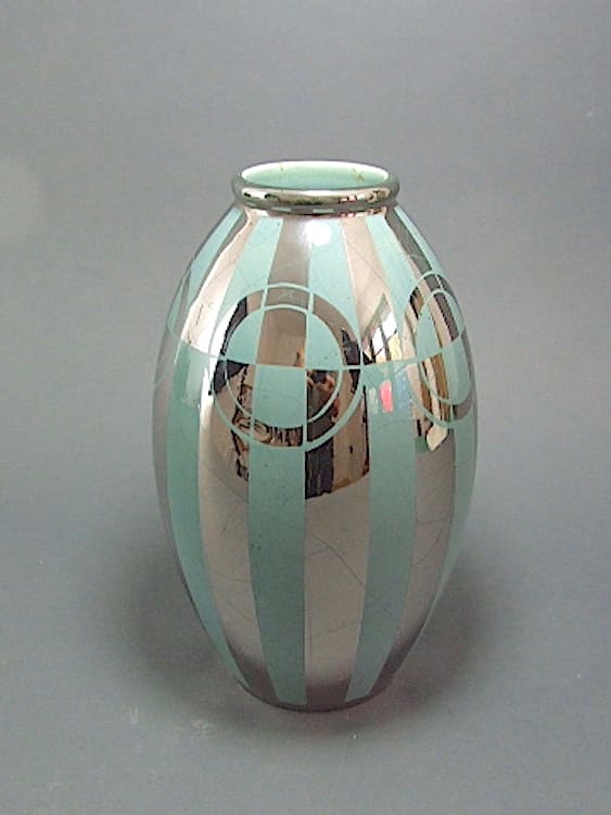 French ceramic vase by the Odyv company with pale blue ground and silver geometric patterning. Is marked ODYV and model number 274 under the base.