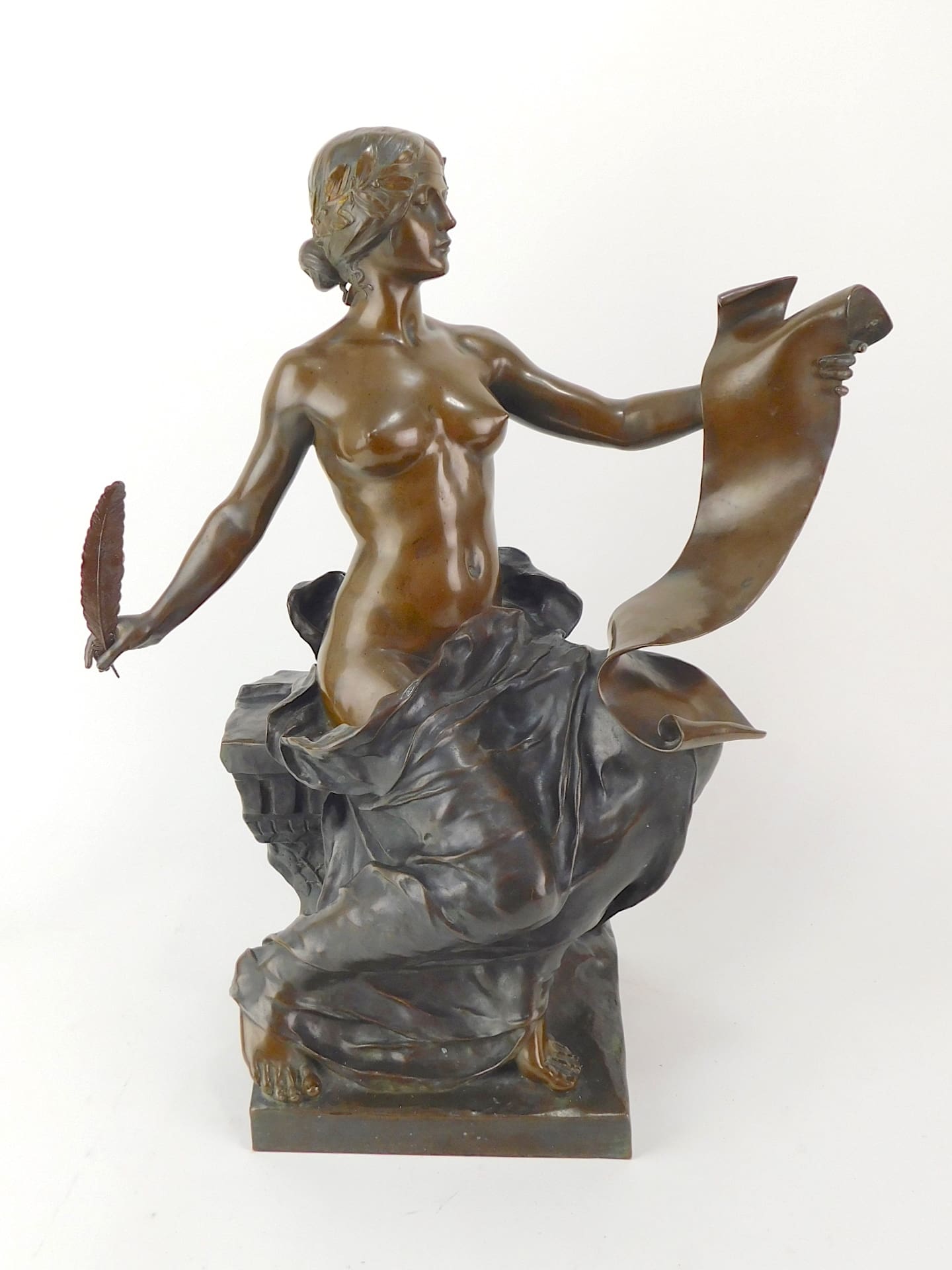 A signed French Art Nouveau patinated bronze holding a scroll titled La Poesie by artist Georges-Marie-Valentin Bareau.