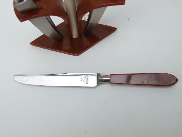 Set of six brown phenolic handled knives and knife rest.