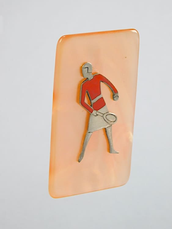 Blue phenolic panel brooch with enamel geometric tennis player.
