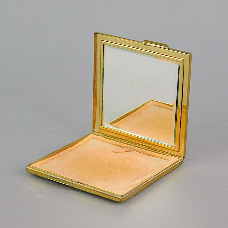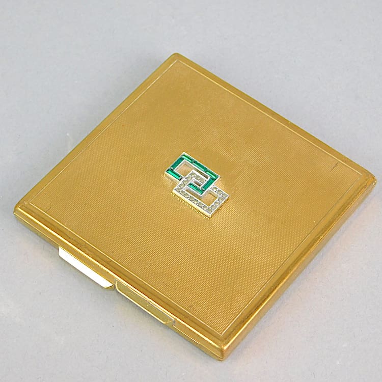 Large machine turned, gilt case with central design in rhinestone and green diamonte. Contains mesh and mirror.