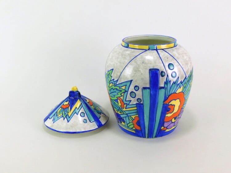 Rare large English art deco ceramic Ginger Jar in the Syrian pattern, made by Thomas Forester. Beautifully hand painted in vivid art deco patterning. Marked to the base Syrian, T F and S made in England and Phoenix.