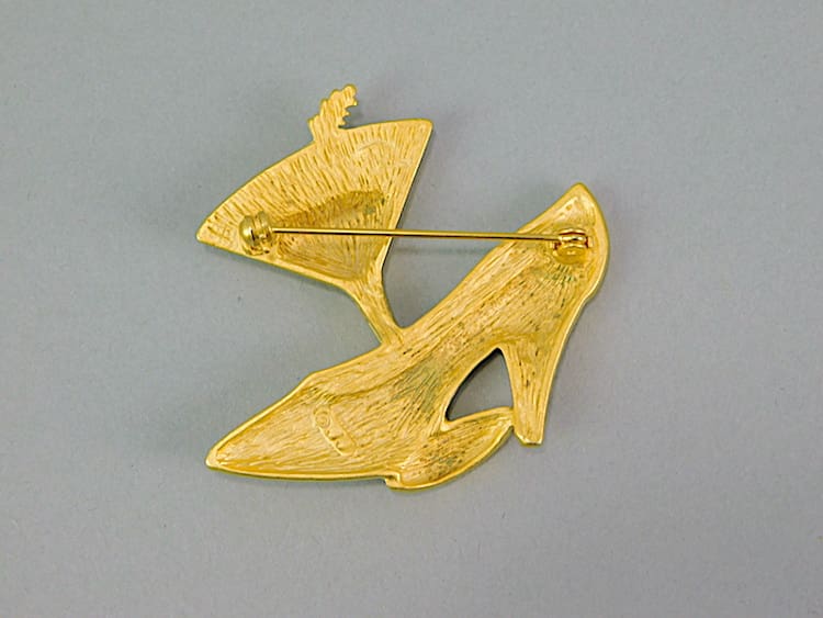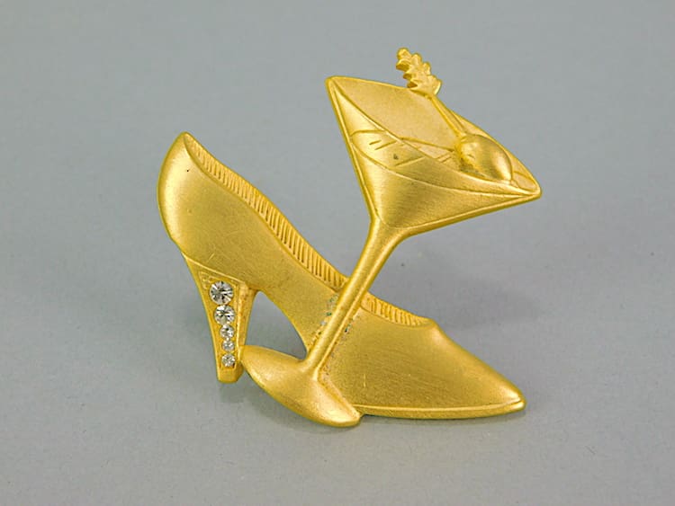 American art deco champagne and shoe brooch with diamonte detail to the heel of the shoe. Made by the Jonette jewellery company in the early 1980s. Stamped to the reverse JJ. Fitted with a roll safety clasp.