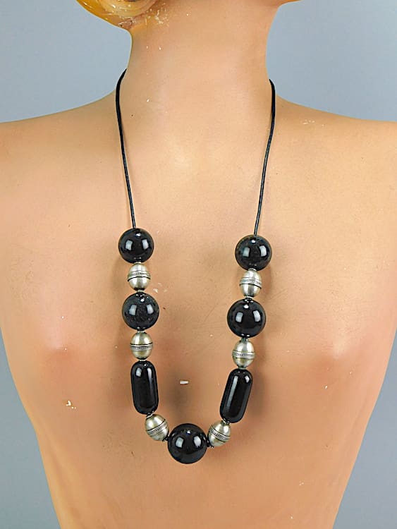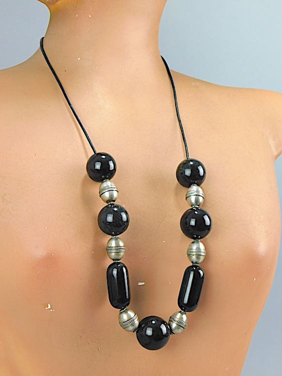 This chunky German necklace has metal and I think stone or possibly glass black beads. It is strung onto leather cord that can be hung at length to suit wearer. It’s possible it could be by Bengel. It is an original 1930’s.