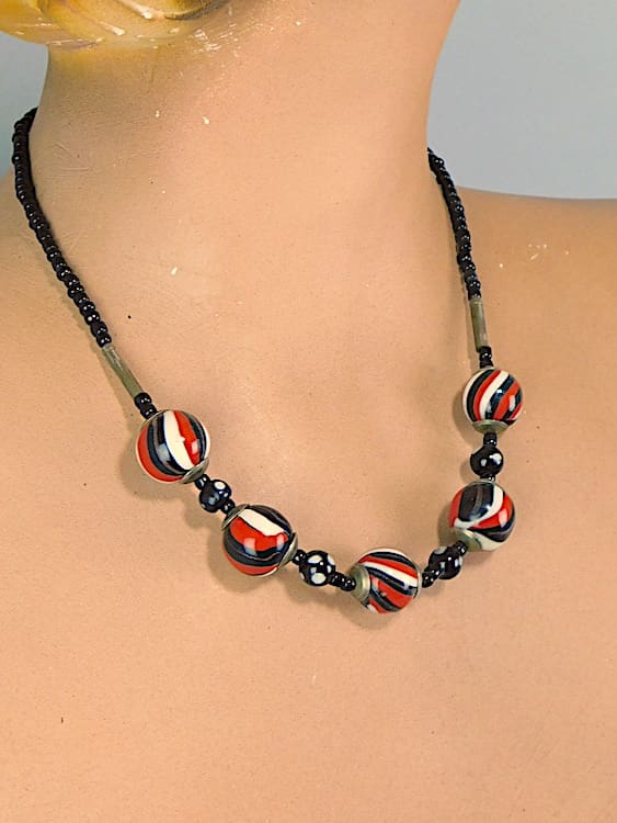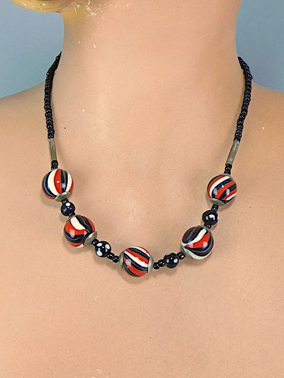 Five large red, white and black swirl beads interspersed with black glass beads and chrome cups.