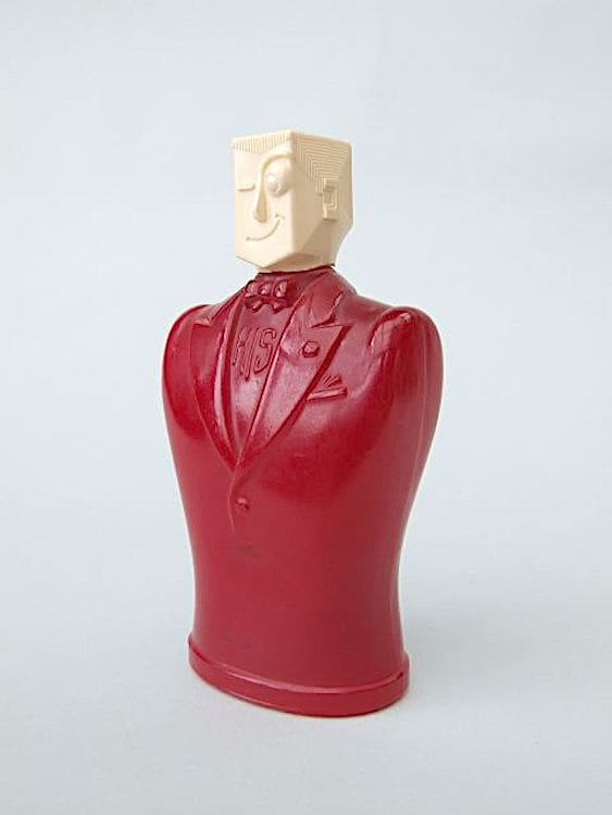 His American red glass bottle with white bakelite head and is marked in the glass to his chest His. There is still some of the original cologne left in the bottle and it smells really nice.