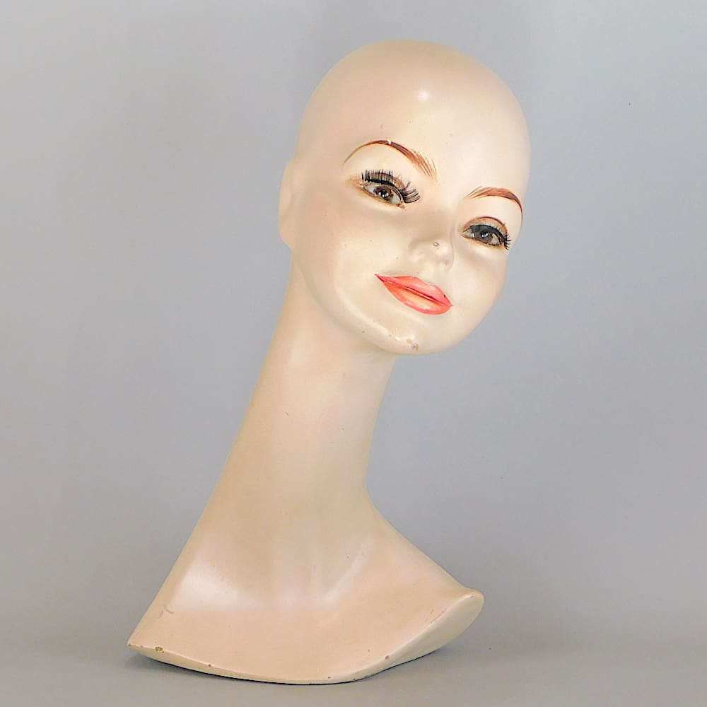 Plaster mannequin with glass eyes and eye lashes.