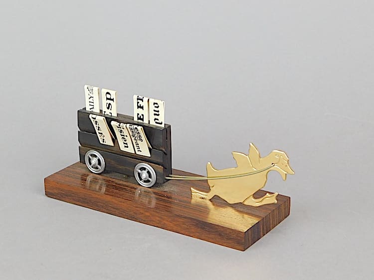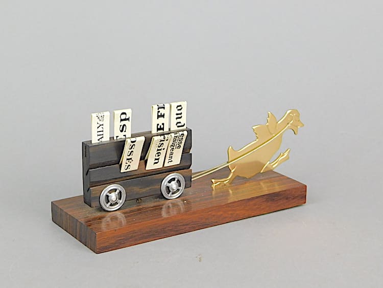 French 2D duck and newspaper trolley – the 7 newspapers are phenolic glass markers. Base is made of macassar ebony. Signed Pizette.