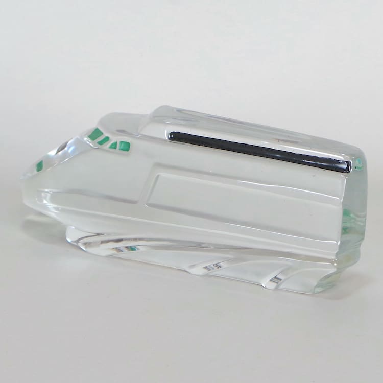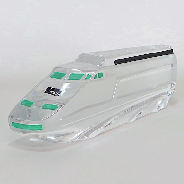 An Art Deco streamline glass train retaining its original Daum stick on label.